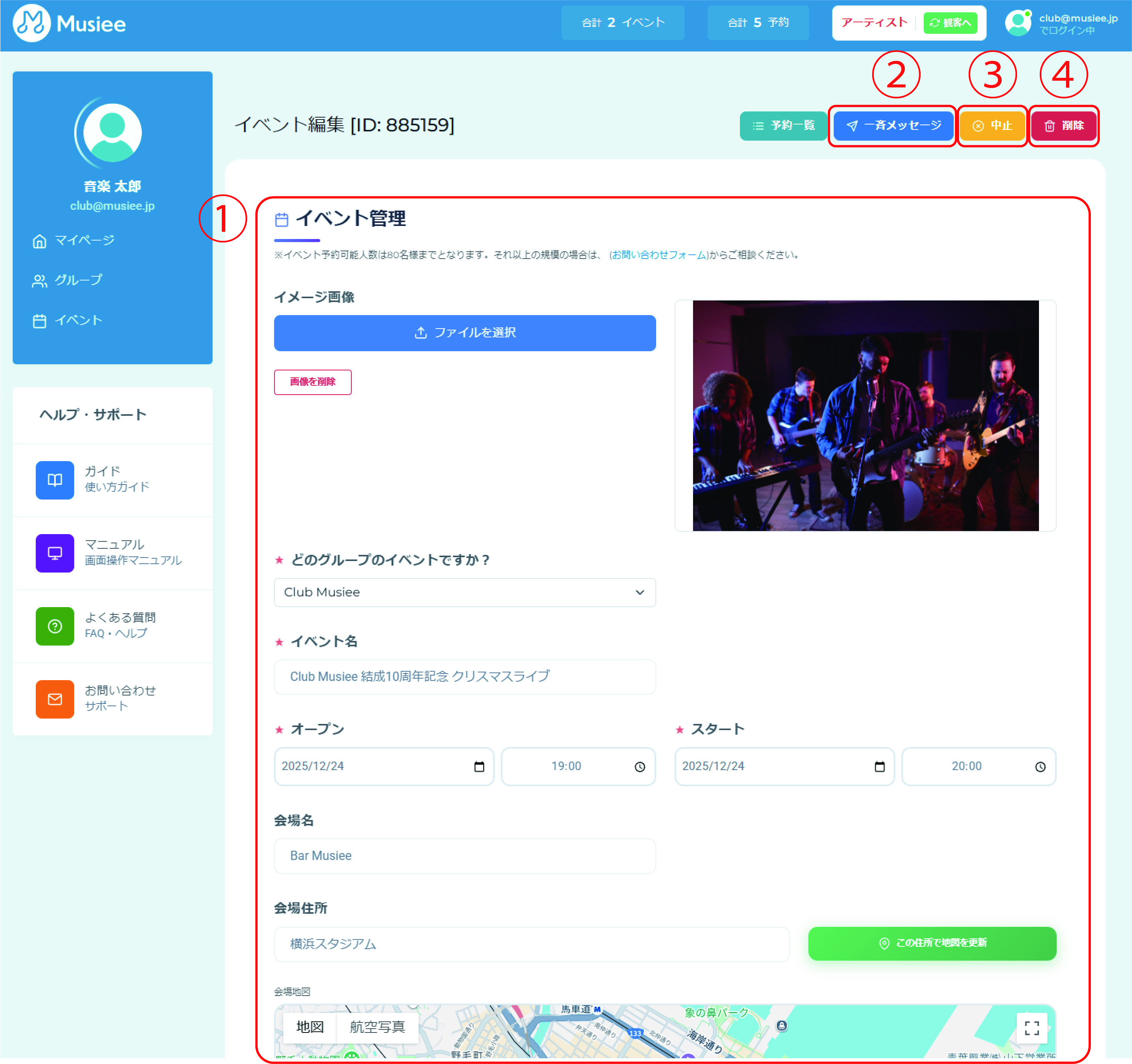 イベント名、開催日時、会場、受付期間など、イベントに関する各種情報を編集できます。編集可能な項目: