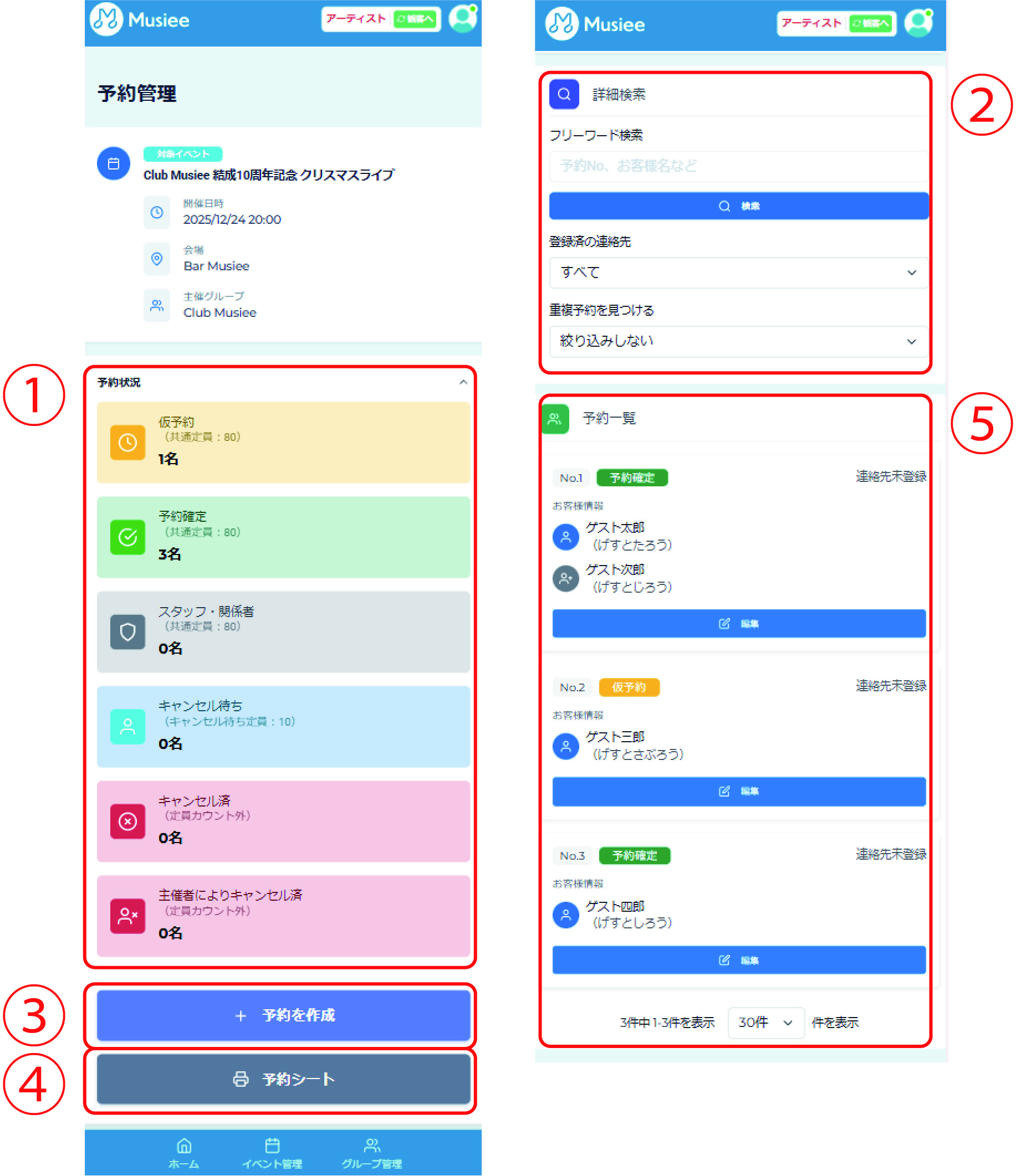 予約ステータスごとの予約人数が確認できます。ステータスをタップすることで予約者一覧の絞り込みが可能です。