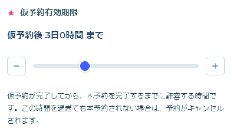 時間をスライドすることで仮予約有効期限が設定できます。(初期設定は72時間)