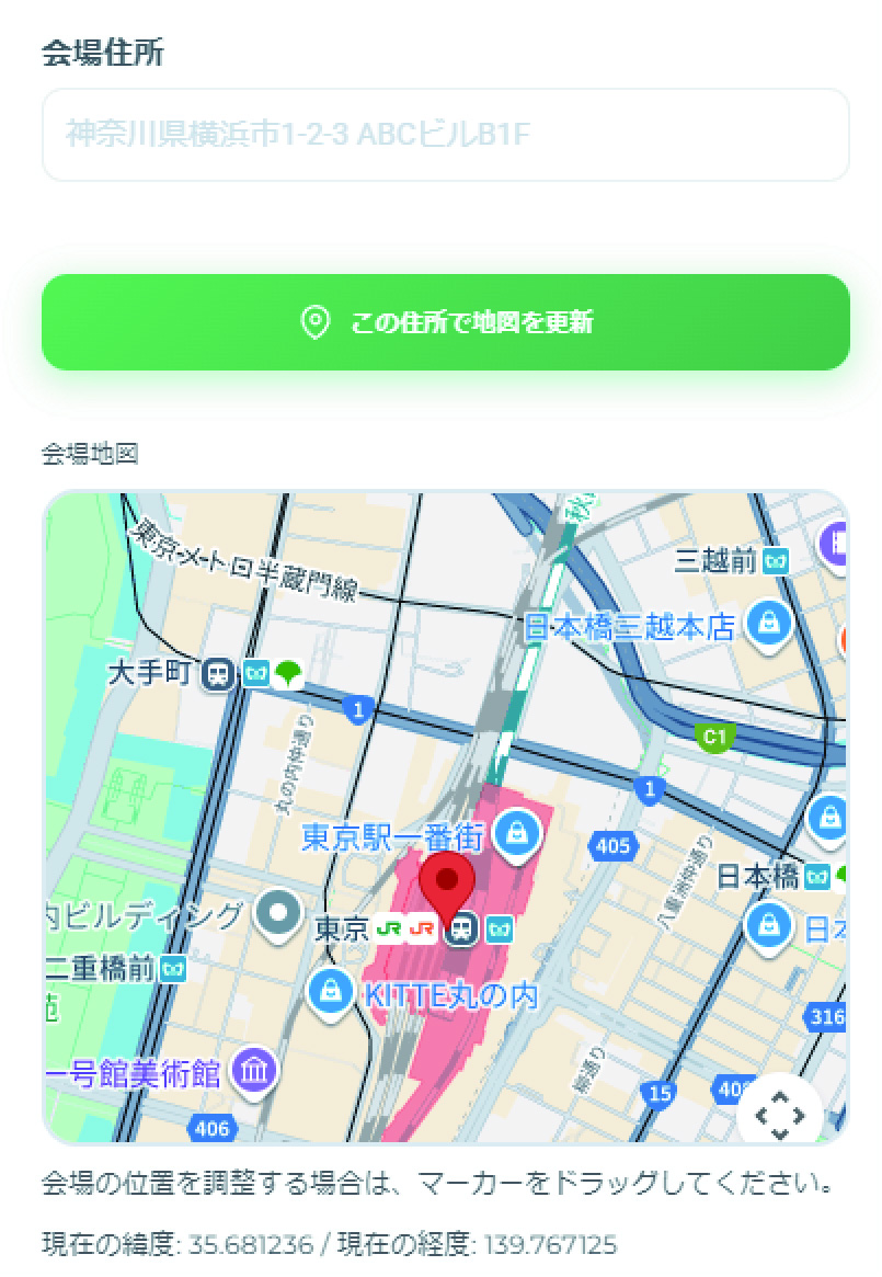 会場住所を入力後、"この住所で地図を更新"を押すことにより地図が更新されます。(位置を調整する場合には、地図内にあるマーカーをドラッグすることにより調整可能です。)
